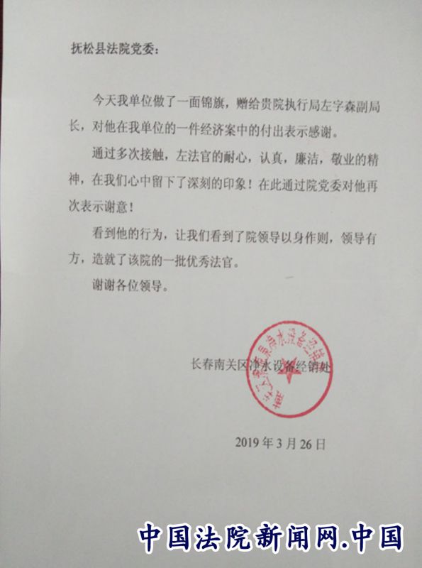 中国法院新闻讯(乔元兀)近日,吉林省抚松人民法院党组领导收到一个特殊的包裹,包裹里装有一面锦旗和一封信函,锦旗是赠给该院执行局副局长、员额法官左字森同志的。当事人通过邮递的方式感谢法官和法院在抚松法院尚属首次,被传为佳话。