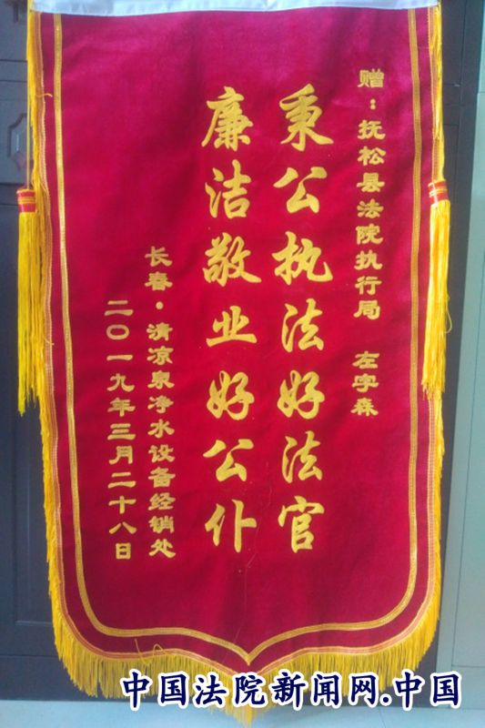 打开锦旗映入眼帘的是:赠抚松县法院执行局左字森“秉公执法好法官,廉洁敬业好公仆”,落款处系长春某净水设备有限公司,时间为2019年3月26日,随快递而来的还附一封信函,里面这样写道:“今天我单位做了一面锦旗,赠给贵院执行局左字森副局长,对他在我单位的一件经济案件中的付出表示感谢,左法官耐心、认真、廉洁、敬业的精神在我们心中留下了深刻的印象,看到了他的行为,让我们看到了院领导以身作则,领导有方……”