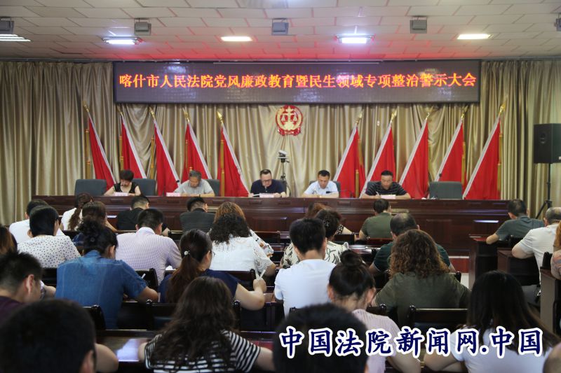 7月25日,喀什市人民法院召开党风廉政教育暨民生领域专项整治警示大会,党组书记、副院长赵录同志主持会议,党组成员及全体干警参加会议。