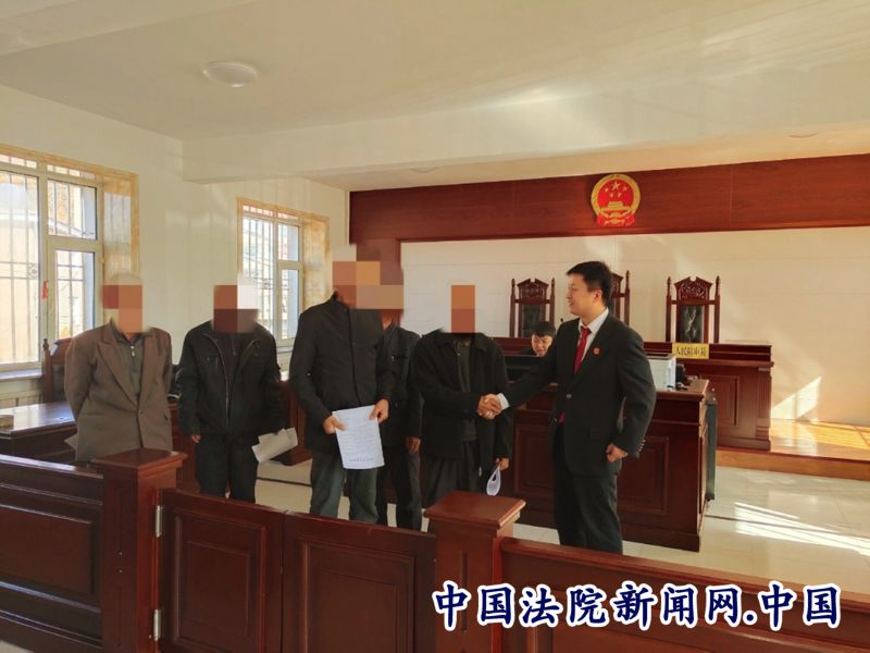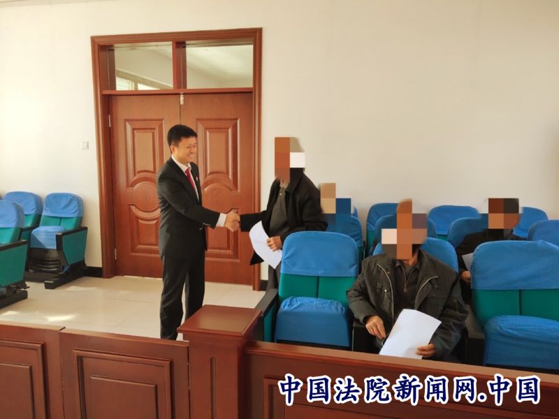 在八道沟法庭审判法庭里,在法官见证下,夏某把拖欠三年的玉米款亲手交到了兄弟五人手中,拿到钱后的五兄弟喜极而泣,紧握着法官范涛的手,久久不愿松开。