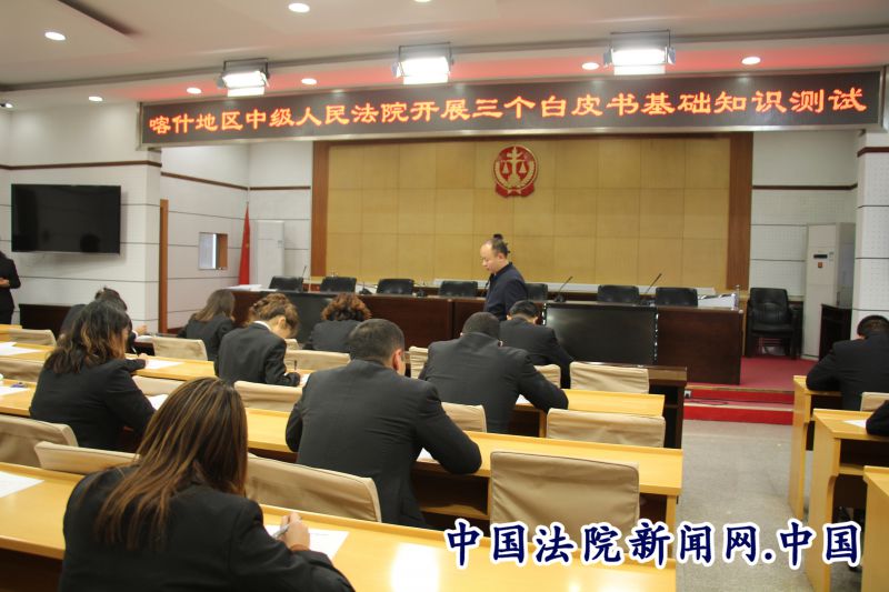 中国法院新闻讯(胡萍)11月25日上午,喀什地区中级人民法院开展了“三个白皮书”基础知识集中测试,组织全院科级干部、一般干部及离退休干部参加了测试,做到了应考尽考。