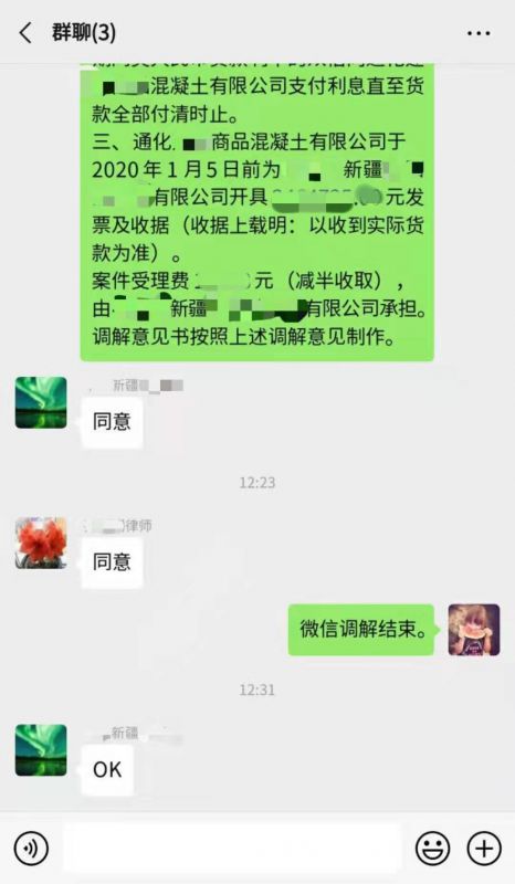 开庭审理后,经过承办法官的耐心沟通,双方当事人均有调解意向,但因新疆某公司需要对调解内容进行内部协商,当庭未能调解成功。考虑到新疆某公司与二道江区法院相距近5000多公里,路途遥远,为减轻当事人的奔波之苦,在征得双方当事人同意后,通过微信群进行调解。在历时四小时的协商后,双方最终达成调解协议:新疆某公司同意给付通化某混凝土公司的货款及部分利息,这起案件最终在“指尖”得到有效化解。
