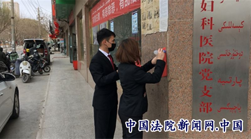 随着 “勇于应战,让党徽在一线闪耀”的口号在喀什中院立案服务大厅响起,支部书记一句:“出发”,活动拉开序幕。由第一党支部支委带队的三个小组12人,分别前往喀什市市内的行政服务大厅、医院、商场、住宅小区等地方,在显眼处张贴提前印制好的《新疆维吾尔自治区喀什地区中级人民法院关于新型冠状病毒感染肺炎疫情防控期间审判工作安排的公告》海报。