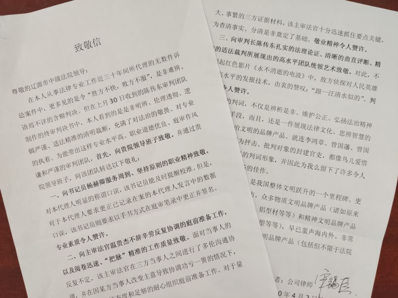 当收到致敬信后,参与案件审理的法官干警们感到非常意外,在他们的眼中,这只是一起再寻常不过的案件、一次再寻常不过的审理、一份再寻常不过的判决,却受到了同为法律人的称赞。