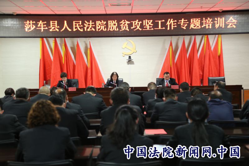 中国法院新闻讯(姜小东)4月22日,莎车县人民法院召开脱贫攻坚工作推进会,院党组书记杨君萍同志出席会议并讲话,院党组班子成员、全院干警及法院7个“访惠聚”驻村工作队队长、成员全体人员参加会议。