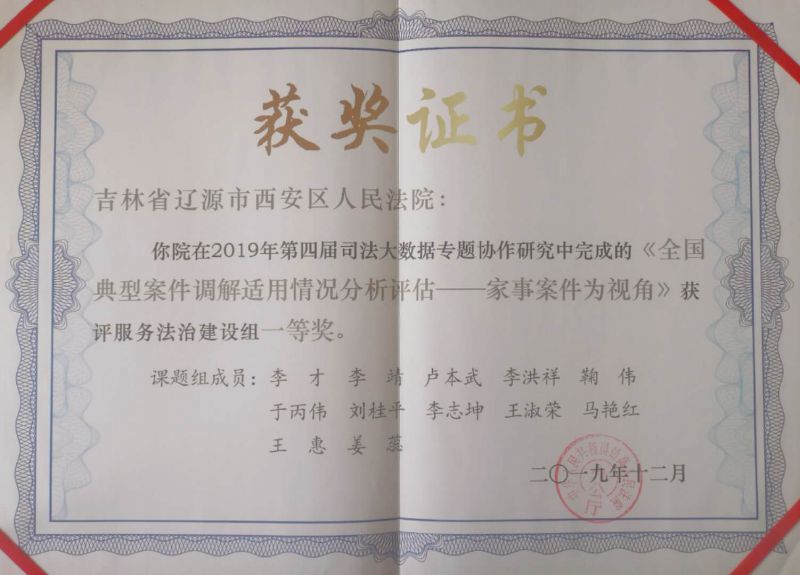 中国法院新闻讯 近日,最高人民法院第四届司法大数据协作专题研究评审结果揭晓,西安区人民法院课题《全国典型案件调解适用情况分析评估——家事案件为视角》荣获服务法治建设组一等奖。该奖项根据专题报告质量、难度系数、成果转化等因素,在服务法治建设组设一等奖2名,二等奖4名,三等奖8名,优胜奖15名。评选结束后,最高人民法院信息中心将获奖课题上传至人民法院大数据管理和服务平台,供全国四级法院干警学习研究。