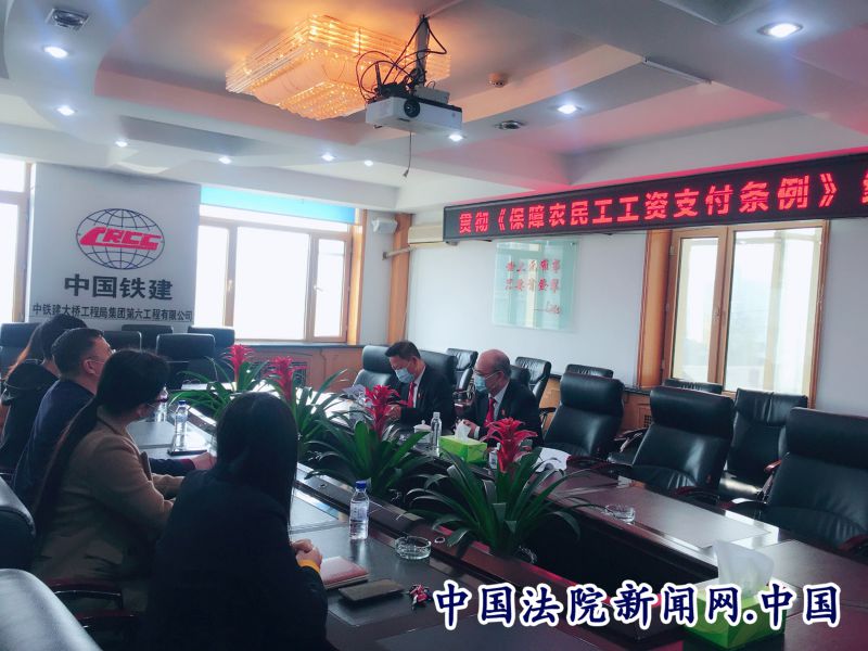4月28日下午,长春铁路运输法院副院长左立杰、综合审判庭庭长韩宝玉等一行四人来到中国铁建大桥工程局集团第六工程有限公司,针对即将实施的《保障农民工工资支付条例》,结合相应案例,对建筑施工企业开展法律宣传。就《条例》内容指出,中国铁建大桥工程局集团第六工程有限公司作为国有企业,同时作为建设施工单位,在对涉及农民工工资发放问题上,要严格依据《条例》规定,落实工资发放问题,保证农民工第一时间拿到自己“辛苦钱”,从而形成国有企业带头守法、用法的典范。