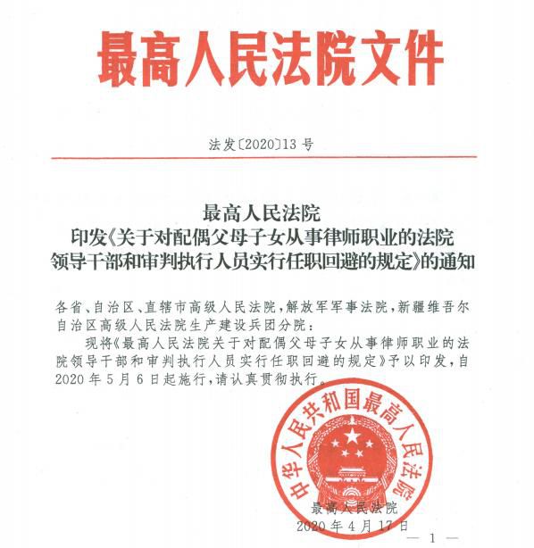 最高法院:关于对配偶父母子女从事律师职业的法院领导干部和审判执行人员实行任职回避的规定