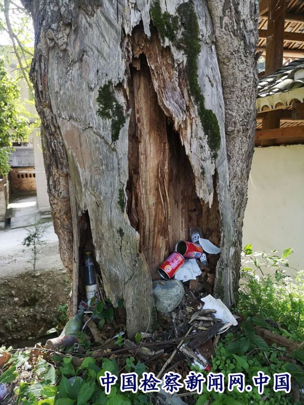 上图,银杏树根部被人为剥皮当药引,树干出现空洞,里面塞有易拉罐、破酒瓶、碗片等垃圾,目前,黎平县检察院已对该采取抢救性保护和复壮措施。