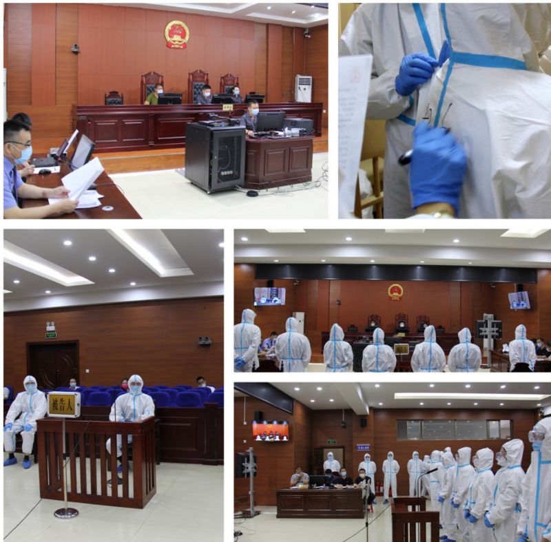 庭审当日早上7点50分,负责提押的法警穿戴好防护服、护目镜、橡胶手套、鞋套,统一在法院乘车前往看守所提押被告人。全部被告人在看守所内完成体温检测,穿戴好防护装备后前往法院,整个提押过程严谨规范、秩序井然。庭审前后,负责消毒的工作人员对审判庭、羁押车辆、羁押室、羁押通道进行彻底、多次消毒。同时,按照《辽源市公安局 辽源市中级人民法院关于疫情期间被告人参加庭审工作规范》的要求,不支持群众到庭参加旁听,被告人家属实行“一名被告人最多不超过二名近亲属”的标准进行实名登记后安排旁听,并对参加庭审人员进行体温检测,旁听人员间隔就座,全面保障庭审疫情防控“零风险”。