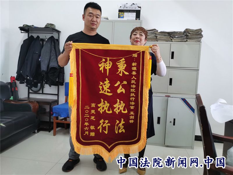 中国法院新闻讯(孟德彪 李浩然)7月1日,申请人高某来到新源县人民法院,给办理她执行案件的法官送来一面“秉公执法,高速执行”的锦旗,对法院执行法官王剑锋高效执行2万多元案款的成果表示感谢。