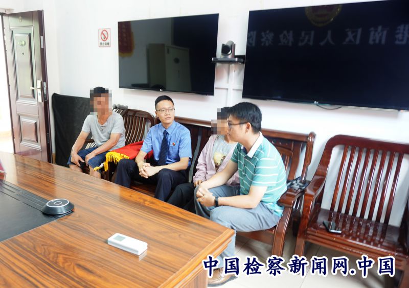 被救助人张某昌夫妇在港南区瓦塘镇三多村第一书记陈兵斌(右一)的陪同下到港南区检察院赠送锦旗